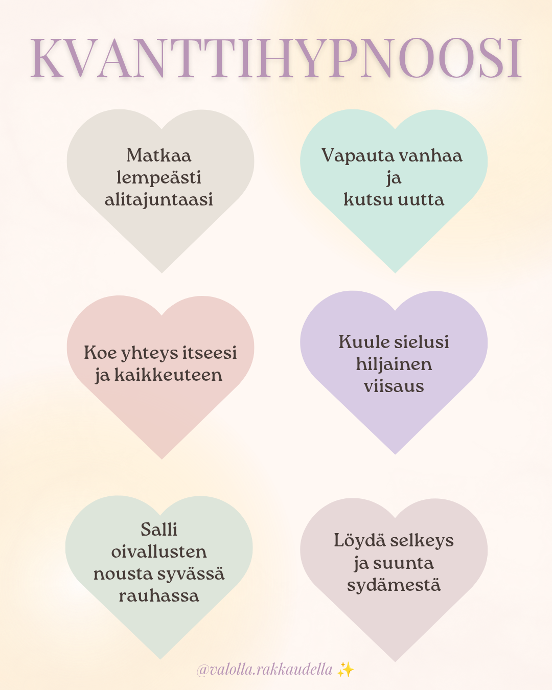 Kvanttihypnoosi on voimakas, mutta lempeä energiahoitomuoto, jossa autan sinua saamaan yhteyden omaan korkeampaan tietoisuuteesi. Istunnon aikana sinulla on mahdollisuus saada ohjausta, vastauksia ja näkökulmia – menneistä, nykyisestä tai tulevasta elämästäsi, tai juuri siitä, mikä tässä hetkessä on sinulle merkityksellistä.